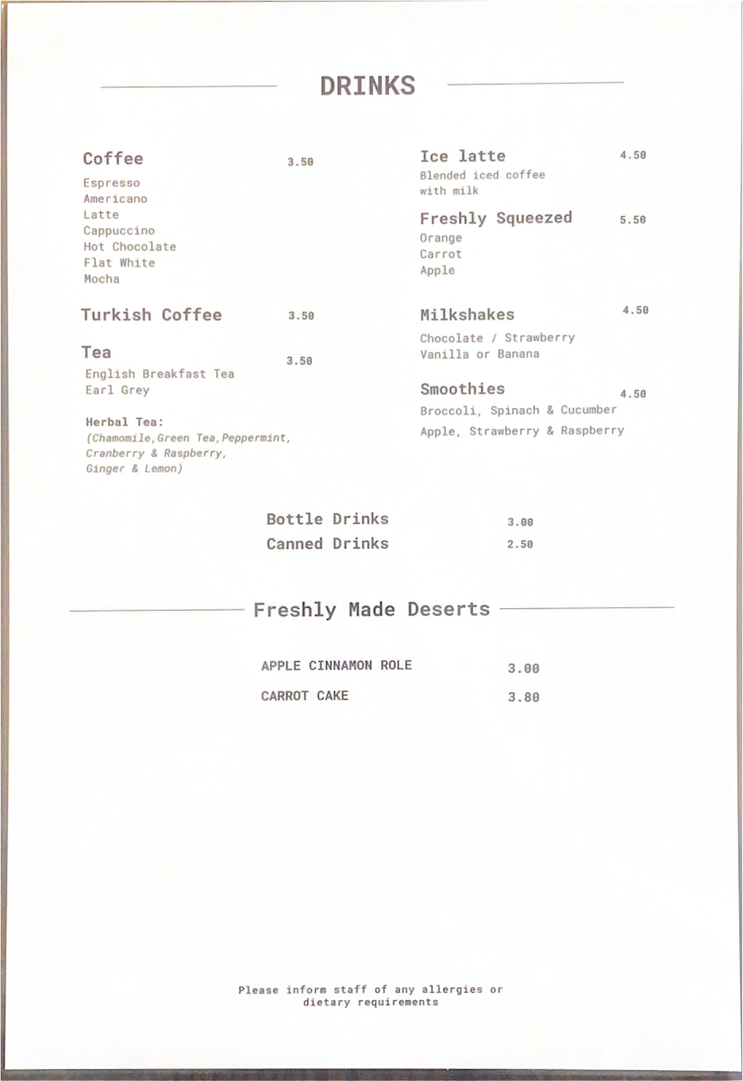Breakfasts include several set options featuring combinations of egg, bacon, sausage, beans, toast, hash browns, mushrooms, and tomatoes, with a choice of a Full English or a Turkish Breakfast that includes items like Turkish sausage, feta cheese, and village honey or jam.